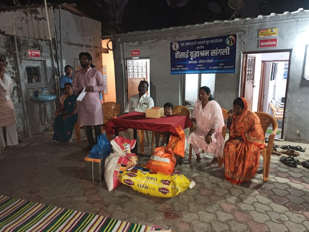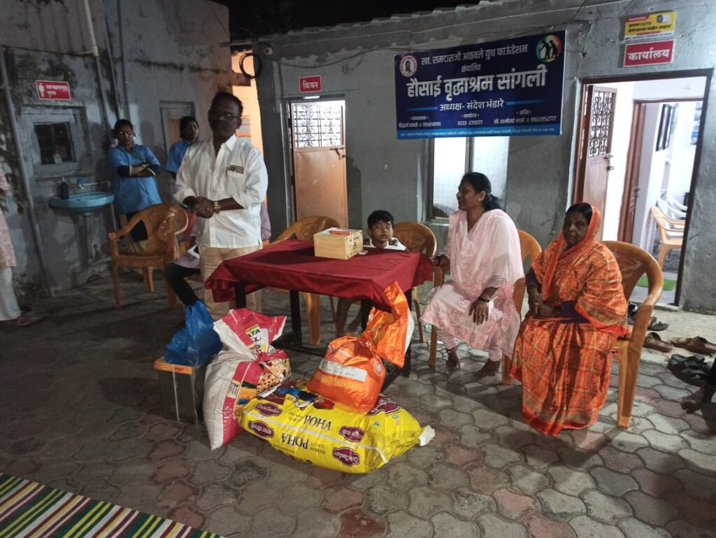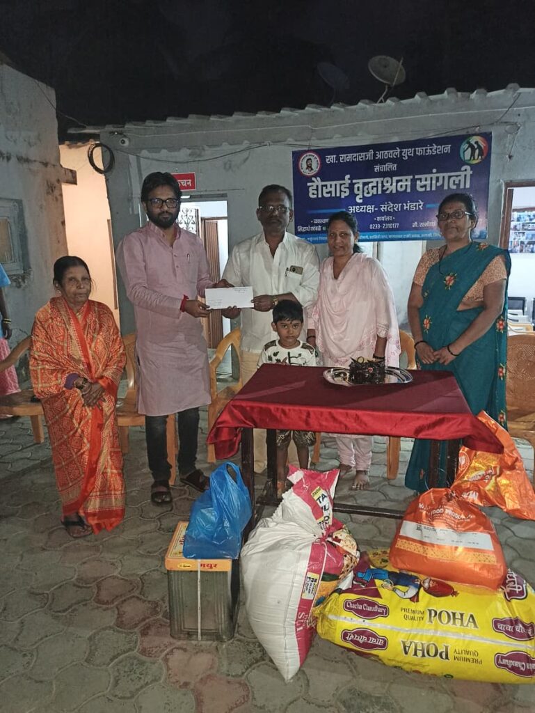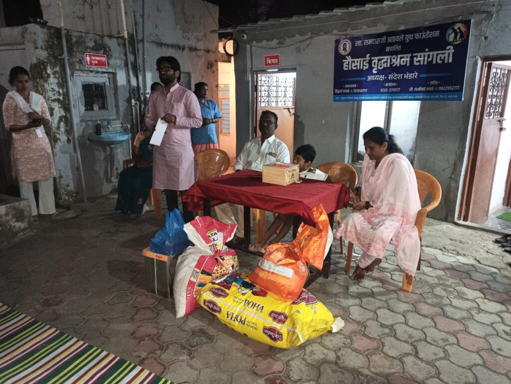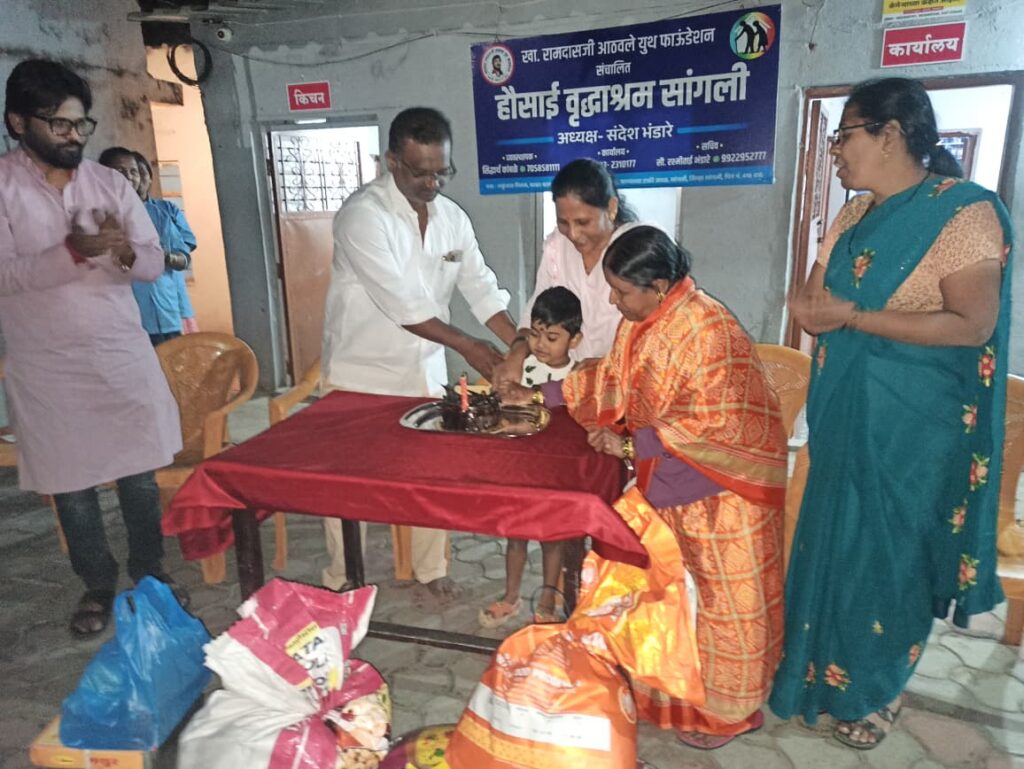 खासदार रामदासजी आठवले युथ फाऊंडेशन संचलित हौसाई वृद्धाश्रम येथे मा. राजकुमार बनसोडे करोली (एम) यांचे चिरंजीव कु. ऋतुराज राजकुमार बनसोडे यांच्या चौथ्या वाढदिवसानिमित्त सामाजिक उपक्रमाचे आयोजन करण्यात आले होते. यावेळी वृद्धाश्रमासाठी धान्यरूपात विविध साहित्य भेट देण्यात आले तसेच वृद्धांना लाडू वाटप करण्यात आले.या प्रसंगी हौसाई वृद्धाश्रमातील अधिकारी व कर्मचारी वर्गाच्या उपस्थितीत केक कापून ऋतुराजचा वाढदिवस मोठ्या उत्साहात साजरा करण्यात आला.